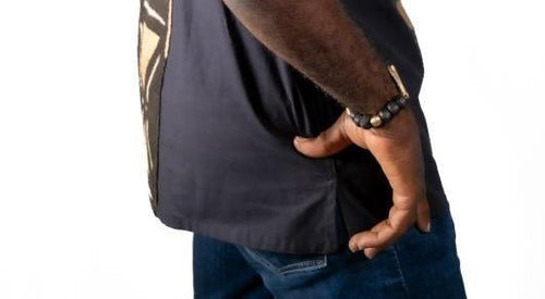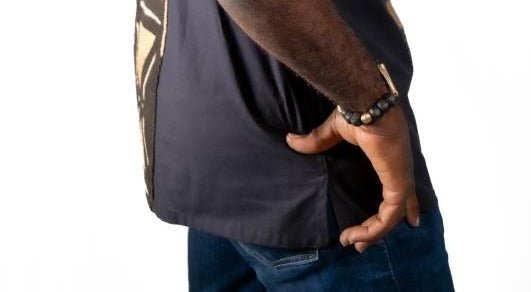La chemise Kaarta bi-matière pour homme est un incontournable du dressing masculin, mêlant habilement le confort du coton à l'élégance traditionnelle du Bogolan africain, tissé à la main.