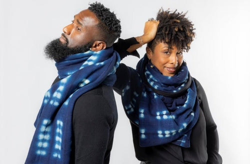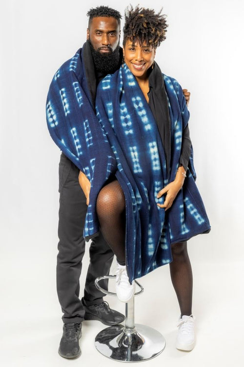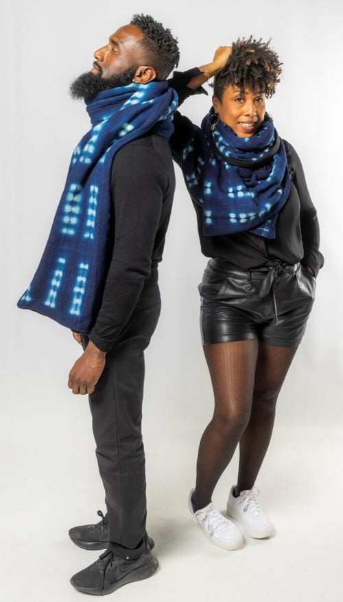 Bleu profond, tissu authentique : écharpe indigo galâ / lépi tissée au Mali, doublée d’une polaire douce. Mixte, élégante, conçue pour durer.