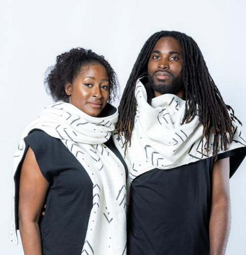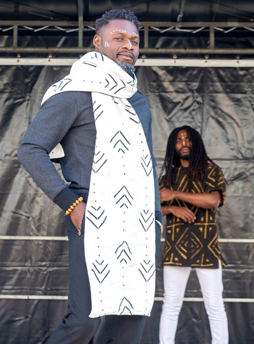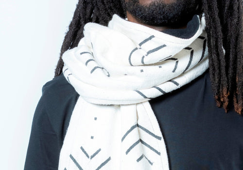 Étole africaine en bogolan blanc/noir – Écharpe mixte doublée polaire