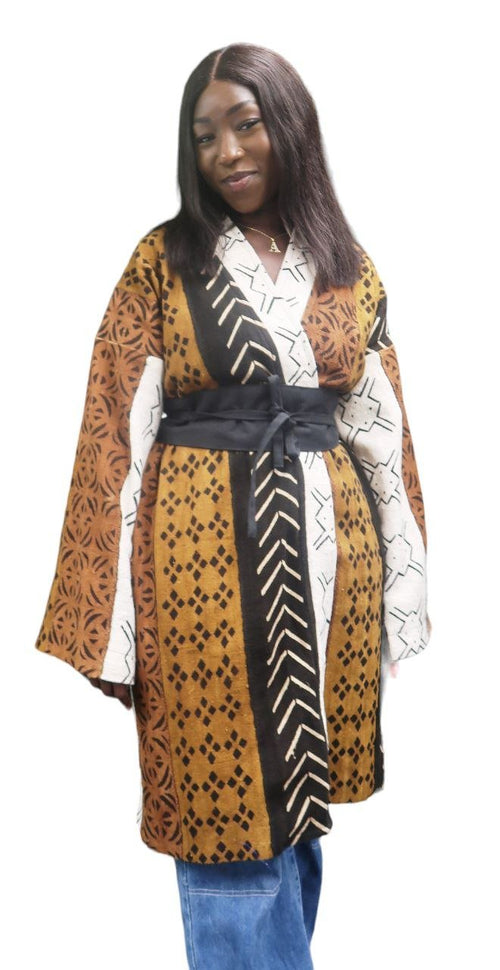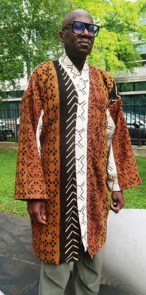 Pièce phare de notre collection en bogolan, ce manteau kimono en bogolan multicolore conjugue héritage textile d’Afrique de l’Ouest et élégance contemporaine. Le bogolan, coton tissé et teint à la main aux pigments naturels au Mali, est ensuite doublé et monté artisanalement dans nos ateliers partenaires au Sénégal. Chaque exemplaire est unique : les harmonies de couleurs varient, c’est sa signature.